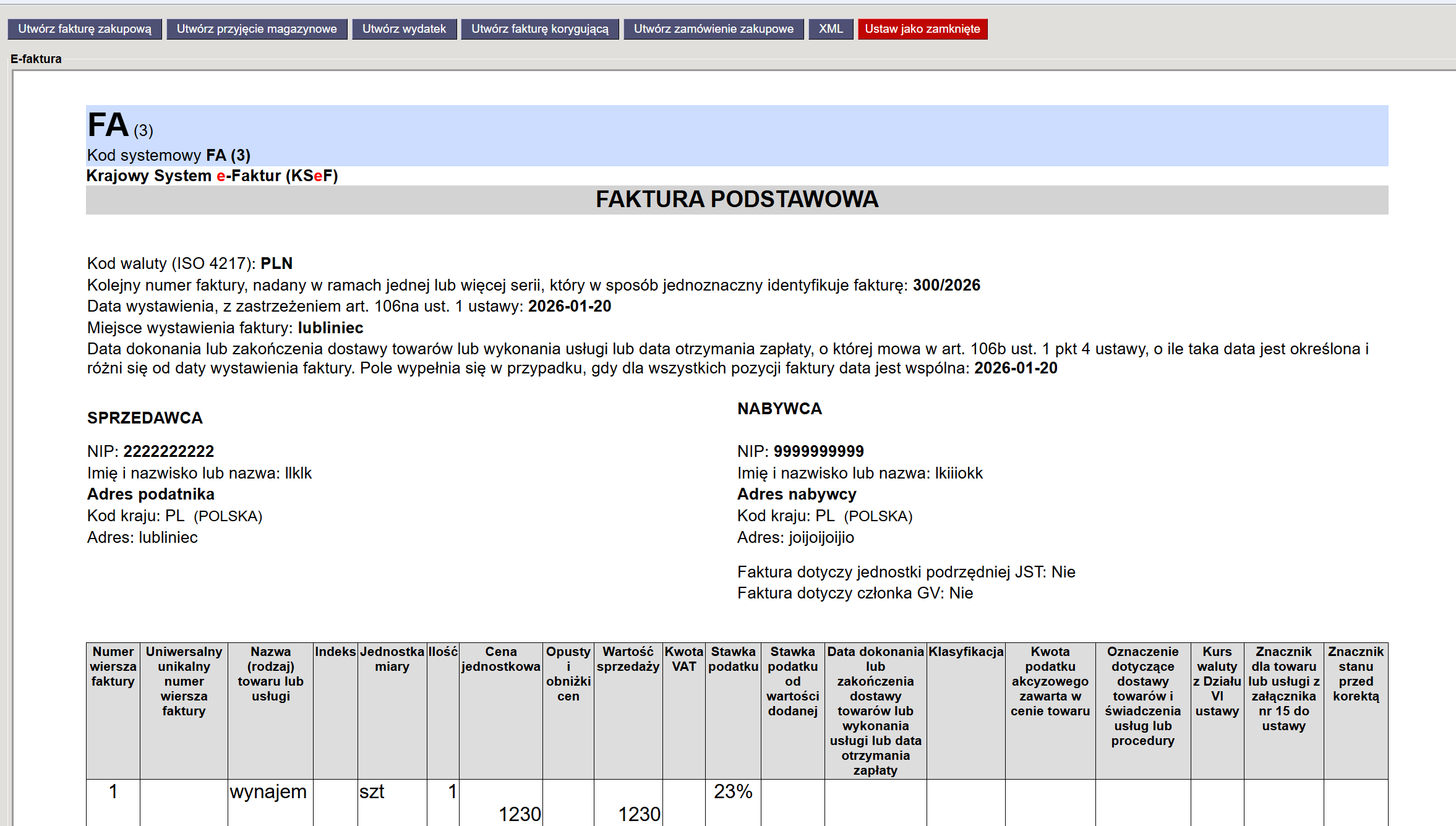 Po oznaczeniu e‑faktury jako zamkniętej znikają przyciski, co uniemożliwia dalsze tworzenie dokumentów na jej podstawie.