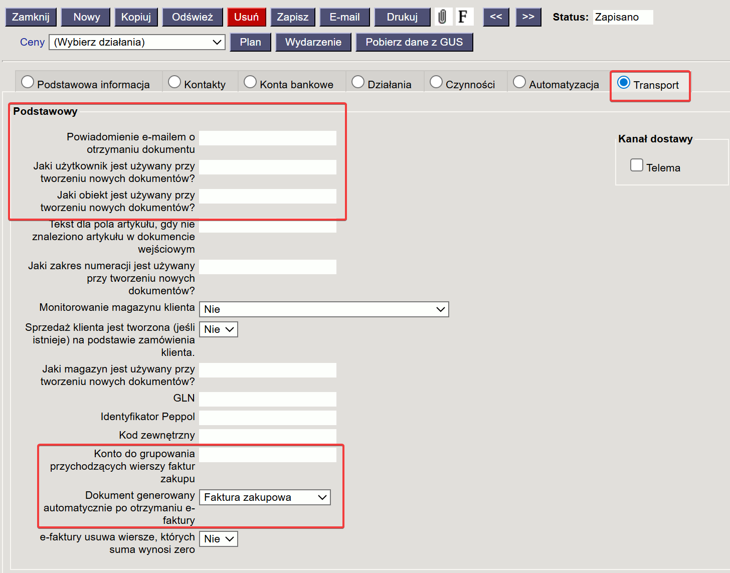 Jeśli faktura elektroniczna zostanie wysłana w formie wiadomości e-mail , ustaw opcję „Automatycznie twórz rekordy transportowe dla dokumentów faktur elektronicznych” na TAK.