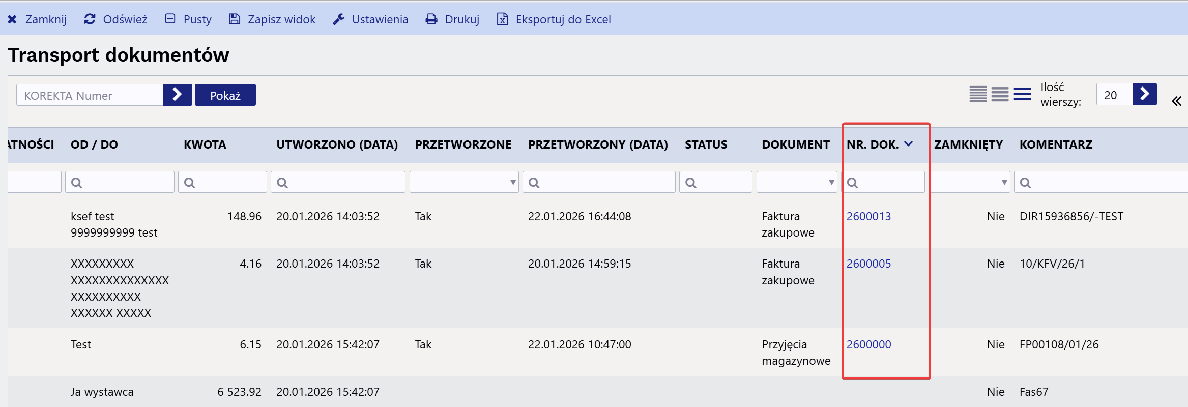 Fakturę zakupu a także przyjęcie magazynowe utworzoną z dokumentu Transport dokumentów można otworzyć, klikając na numer utworzonego dokumentu w kolumnie NR. DOK. w liście dokumentów Transport dokumentów: