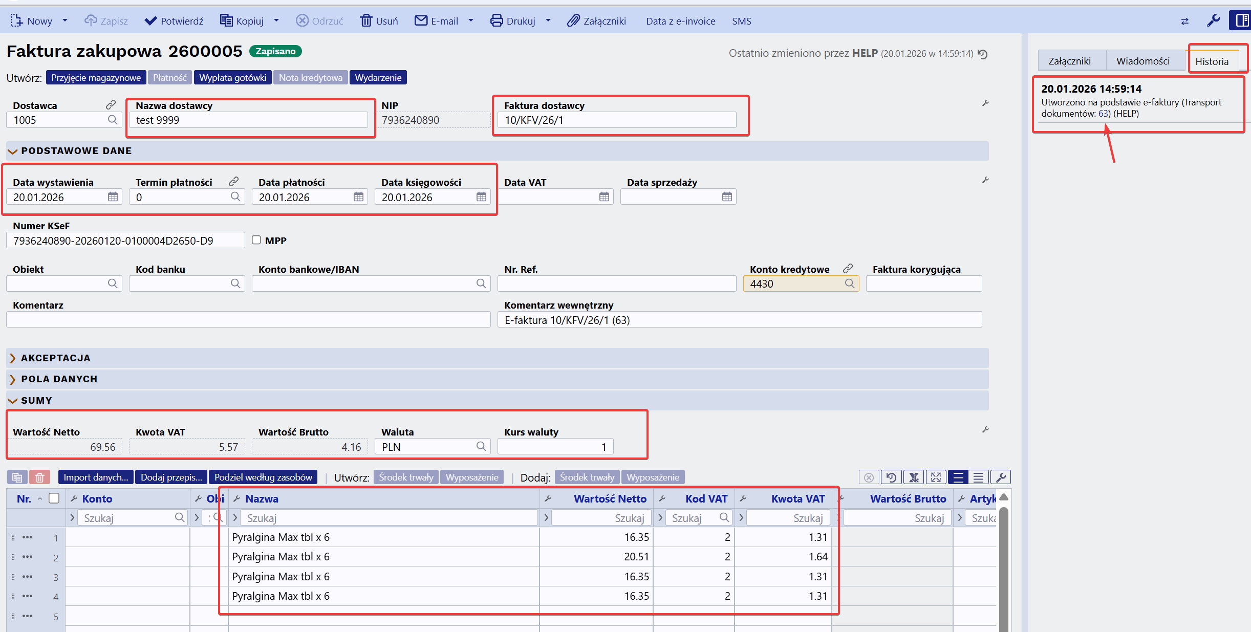 Utworzona faktura zakupu zostanie automatycznie uzupełniona informacjami z pliku XML. Załączniki przesłane z e‑fakturą zostaną również dołączone do dokumentu.