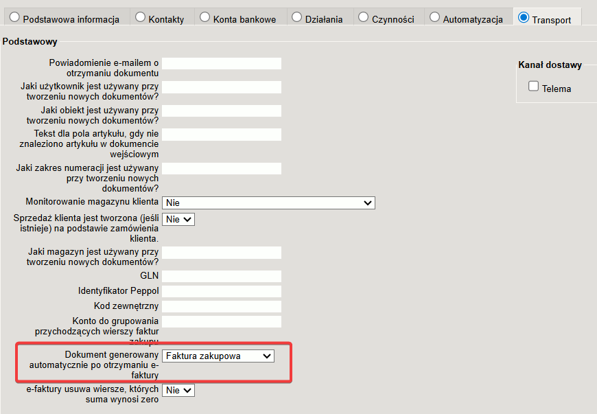 Jeśli faktura elektroniczna zostanie wysłana w formie wiadomości e-mail , ustaw opcję „Automatycznie twórz rekordy transportowe dla dokumentów faktur elektronicznych” na TAK.