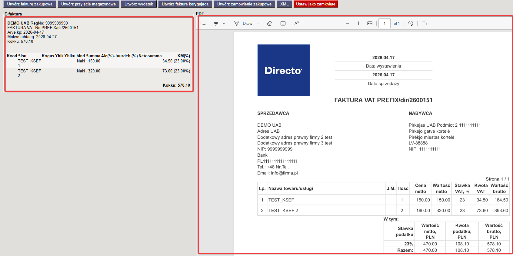 2.1. Faktura zakupu utworzona z e-faktury